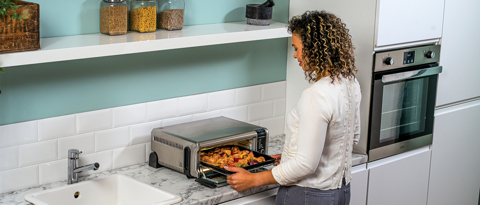 Электропечь можно хранить вертикально на боковой панели, что позволяет занимать на 50% меньше пространства. Девайс легко очищается, поскольку задняя панель открывается, а поддон легко снимается. В вашем распоряжении таймер, цифровой экран и внутреннее освещение.